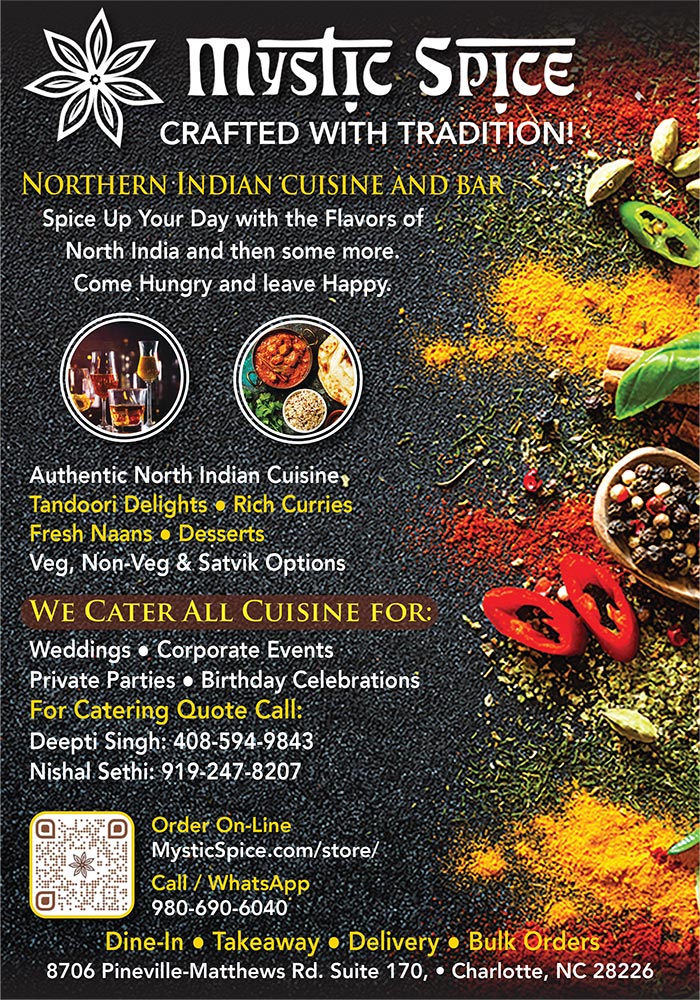 Mystic Spice Restaurant in Charlotte offers both North Indian Cuisine crafted with tradition and a bar. Enjoy your meals with hand picked wines and crafted cocktails / mocktails. They also have take-out & delivery via DoorDash & UberEats.