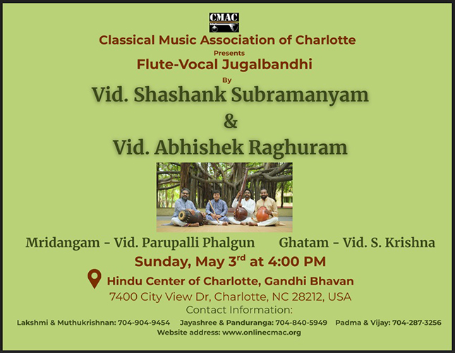 The Classical Music Association of Charlotte (CMAC) presents a Flute-Vocal Jugalbandhi with Vid. Shashank Subramanyam, Vid. Abhishek Raghuram, Vid. Parupalli Phalgun, and Vid. S. Krishna. The performance will be held on Saturday, May 3, 2026 starting at 4pm at the Hindu Center of Charlotte’s Gandhi Bhavan. For more information, contact 704-904-9454 or visit onlinecmac.org.